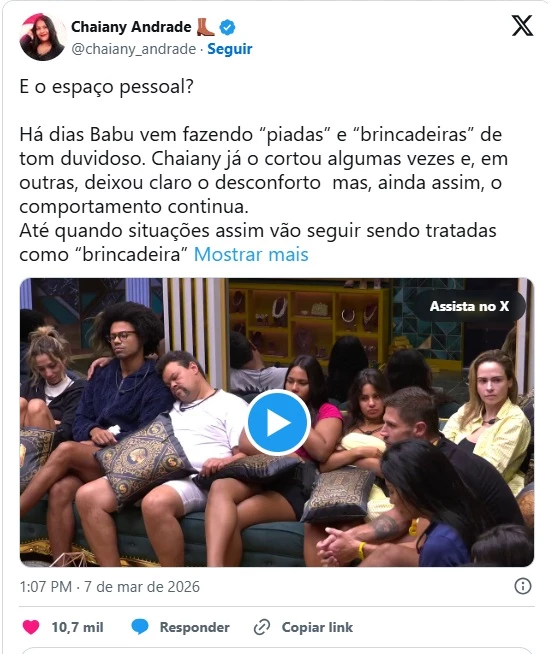 Em outra publicação, a equipe compartilhou o vídeo que originou a polêmica e voltou a questionar o comportamento do ator no BBB 26. Os administradores ressaltaram que Chaiany Andrade já teria demonstrado desconforto em algumas ocasiões e cobraram maior atenção ao respeito ao espaço pessoal dentro do reality show. A repercussão do caso segue intensa nas redes sociais.