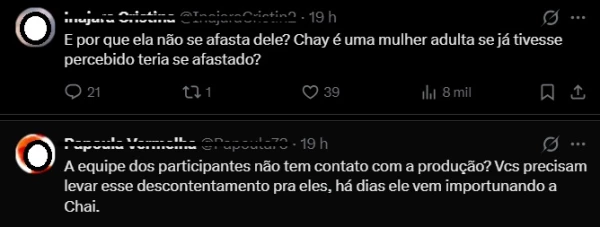 Entretanto, um comentário de um internauta chama a atenção. Ao invés de demonstrar apoio à sister, um internauta critica a atitude dela. “E por que ela não se afasta dele? Chay é uma mulher adulta se já tivesse percebido teria se afastado?”, escreveu. Outro comentário que chama atenção é de um seguidor cobrando um posicionamento da equipe.
