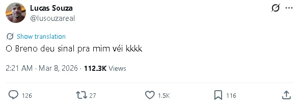 Segundo o dançarino, o participante Breno teria feito um gesto em sua direção durante a festa. Na publicação, Lucas afirmou que o brother teria dado um “sinal” para ele enquanto o show acontecia. “O Breno deu sinal pra mim véi kkkk”, afirmou bailarino.