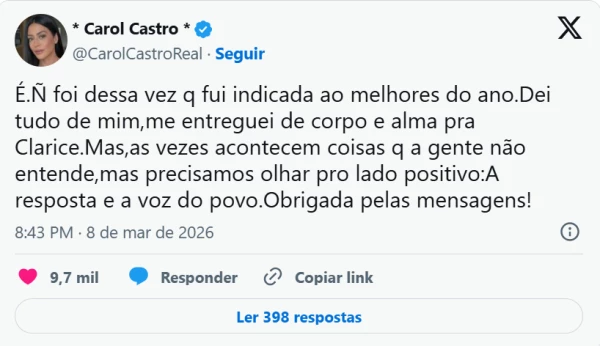 Mesmo diante da frustração por não figurar na lista oficial da premiação, a atriz optou por valorizar o reconhecimento direto de quem a acompanha, finalizando sua reflexão ao dizer: “Às vezes acontecem coisas que a gente não entende, mas precisamos olhar pro lado positivo. A resposta e a voz do povo. Obrigada pelas mensagens!”.
