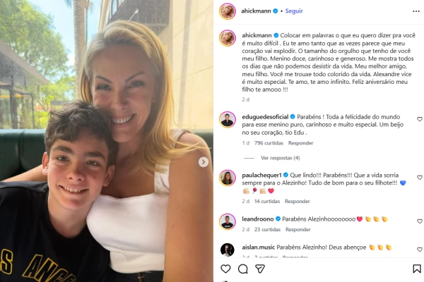 Na publicação, Ana abriu o coração ao falar sobre o amor que sente pelo filho e destacou o orgulho que tem de acompanhar o crescimento do menino. Em uma mensagem carregada de carinho, a apresentadora descreveu Alexandre como um garoto doce, carinhoso e generoso, afirmando que ele trouxe mais cor e sentido à sua vida. A homenagem rapidamente chamou a atenção dos seguidores, que lotaram os comentários com mensagens de parabéns ao jovem.