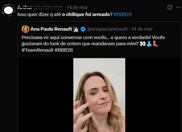 Uma publicação envolvendo Ana Paula Renault gerou grande repercussão nas redes sociais após a divulgação de um vídeo relacionado ao figurino usado no BBB26. O conteúdo foi divulgado neste sábado (14) pela equipe da jornalista e mostra uma gravação feita antes do início do confinamento, na qual ela comenta sobre a roupa enviada pela produção para uma festa exibida no Big Brother Brasil.