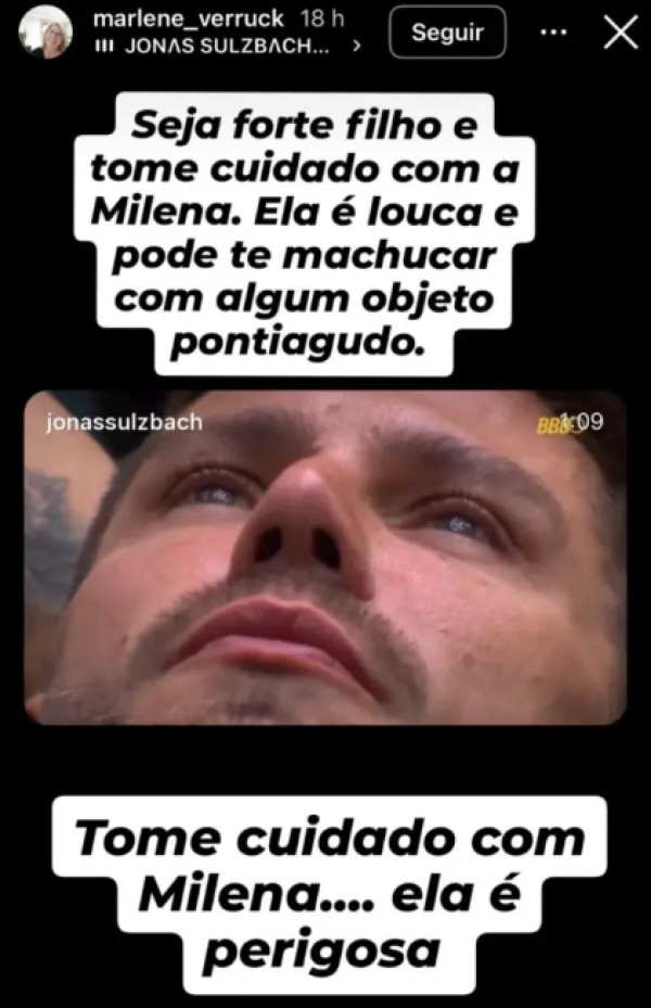 Em recado nas redes sociais, a mãe de Jonas escreveu que ele precisava tomar cuidado com Milena no confinamento do BBB26. “Ela é louca e pode te machucar com algum objeto pontiagudo. Ela é perigosa”, disparou Marlene, ao detonar a sister publicamente.