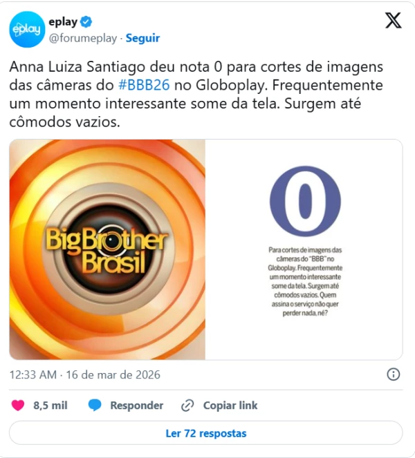 “[Nota zero] Para cortes de imagens das câmeras do BBB no Globoplay. Frequentemente um momento interessante some da tela. Surgem até cômodos vazios. Quem assina o serviço não quer perder nada, né?”, disparou a jornalista. A avaliação destaca a frustração dos assinantes que, ao buscarem acompanhar o reality apresentado por Tadeu Schmidt em tempo real, acabam perdendo acontecimentos relevantes devido a falhas ou escolhas de direção nas imagens.