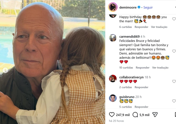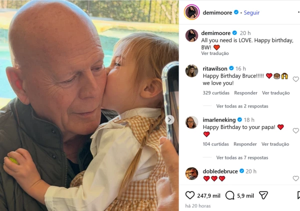 Bruce Willis celebrou 71 anos de idade na última quinta-feira, dia 19 de março. O ator recebeu uma homenagem de sua ex-esposa, a atriz Demi Moore, por meio de uma publicação em rede social.
