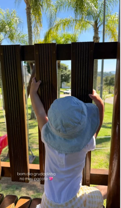 Na imagem, a pequena aparece de costas, usando um chapéu claro e roupas leves, enquanto observa um jardim iluminado pelo sol. Ao comentar o momento, Jade demonstrou carinho ao destacar o quanto gosta de estar próxima da filha logo nas primeiras horas do dia, reforçando a conexão entre as duas.