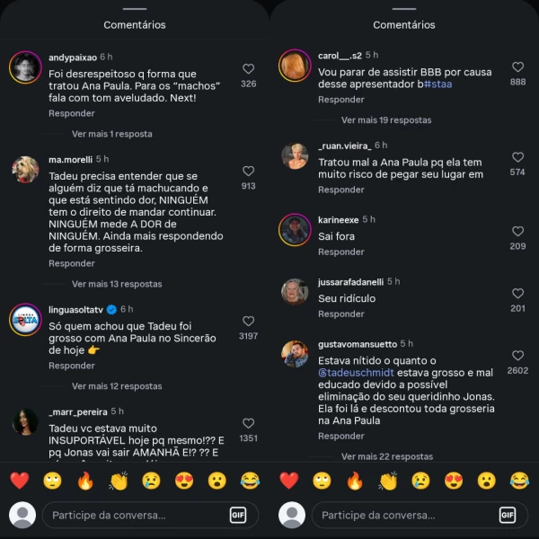 No Instagram, a última publicação do comunicador já ultrapassa os 10 mil comentários. Internautas acusam o apresentador de ter sido desrespeitoso pela forma como tratou Ana Paula Renault. “Tadeu estava muito insuportável”, disparou uma usuária.