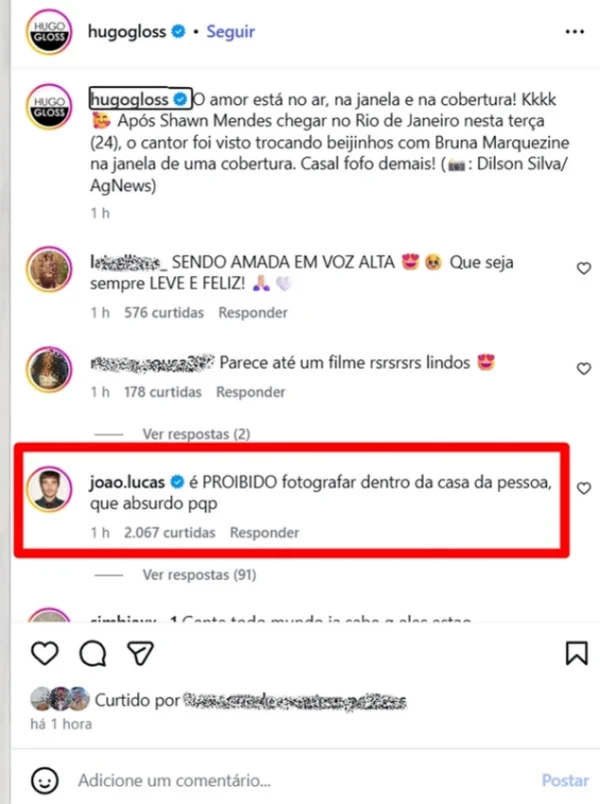 O cantor João Lucas, marido de Sasha Meneghel e amigo pessoal da atriz, manifestou publicamente sua indignação com a exposição das cenas. “É proibido fotografar dentro da casa da pessoa, que absurdo”, escreveu o artista em um post do perfil Hugo Gloss no Instagram.