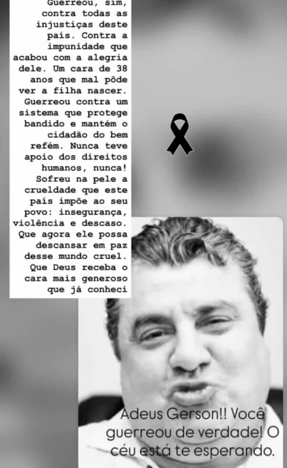 Em seu desabafo, Denize ressaltou a bravura de Gerson ao enfrentar as sequelas do crime e criticou duramente a impunidade e as falhas do sistema brasileiro. Ela enfatizou que ele foi um verdadeiro guerreiro que lutou contra as injustiças de um cenário que o impediu de desfrutar plenamente da paternidade e da própria juventude, tornando-o refém de uma violência que interrompeu sua alegria aos 38 anos.