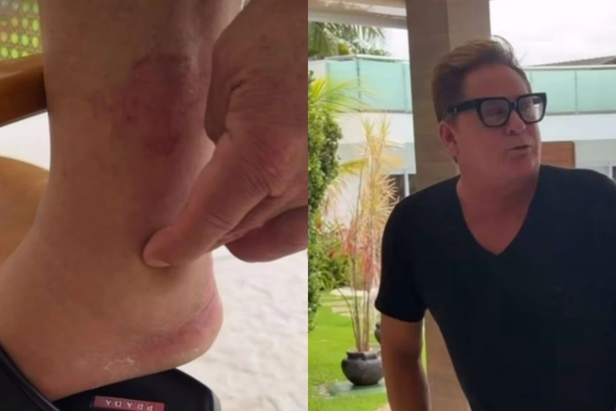 Cantor Leonardo arruma um ‘culpado’ por estar com o pé inchado e diverte a esposa.